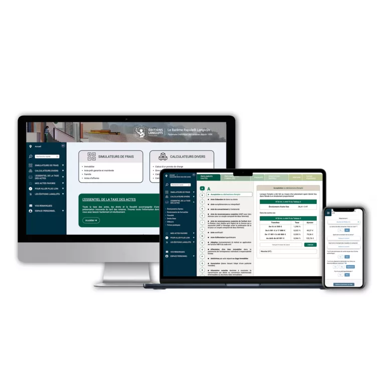En sʼabonnant à la solution digitale Langloys, votre office fait le choix de doter ses collaborateurs non seulement dʼun outil métier intuitif de calcul et de simulation de la taxe des actes notariés mais aussi dʼune bibliothèque de fiches juridiques, de pense-bêtes et dʼavis dʼexperts pour aller plus loin dans la compréhension des calculs. En plus des simulateurs Langloÿs, accédez au tarif des notaires et à la taxe des actes en quelques clics ESSENTIEL en ligne).